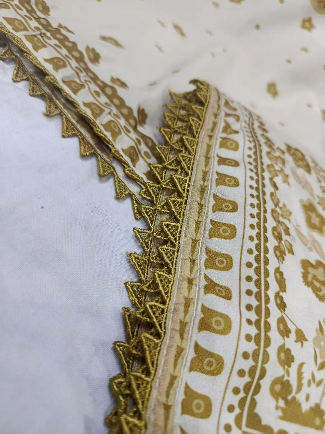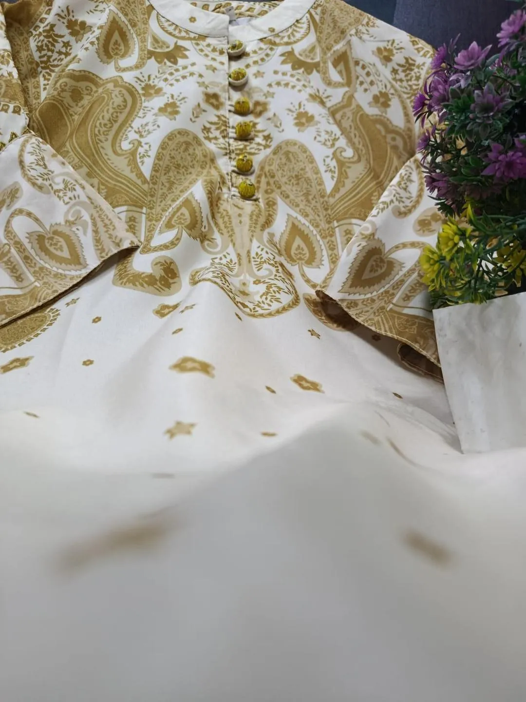 • Fabric: Swiss Lawn• Pattern: Printed• Neck Type: Round Neck• Shirt Pattern: Printed• Trouser Fabric: Swiss Lawn• Trouser Pattern: Printed• Product Feature: Size Chart Attached, Perfect For Everyday Wear• Available Sizes: Medium, Large• Number Of Pieces: 2 Pcs• Color: Golden• Package Includes: 1 x Shirt, 1 x Trouser• Shirt Length: 35 Inches• Shirt Chest: 21 Inches• Trouser Length: 37 Inches• Eve New Printed 2 Peace Co-Ord Set Arrival By PISTA COLLECTION ? ?• ?FULL PRINTED SHIRT WITH BORDER LACE WITH PRINTED FLAPPER WITH BORDER LACE AND PREMIUM KAAJ BUTTONS ??• 2 ELEGANT COLORS• GOLDEN?• BLUE ?• *SIZE*MEASUREMENTS• Medium:• Shirt: Chest 21″, Length 34″, Armhole 8″• Trouser: Length 37″, Waist 42″ (Elastic)• Large:• Shirt: Chest 22″, Length 35″, Armhole 10″• Trouser: Length 38″, Waist 44″ (Elastic)• STUFF PREMIUM CRAPE