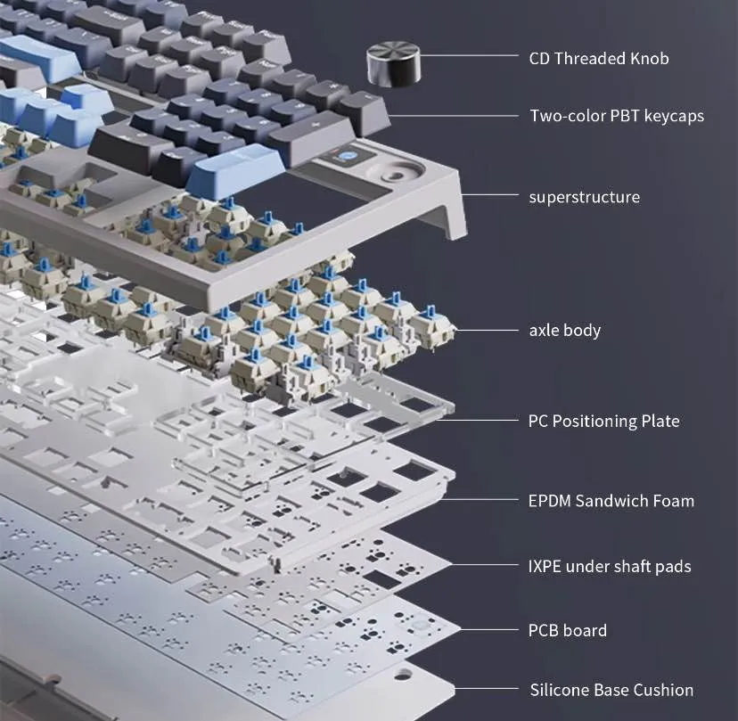 Gasket-mounted design gives comfortable, slightly “soft” typing.