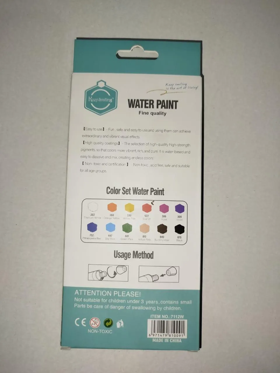 • Material: Solid Watercolor Paints• Number Of Pieces: 12 Pcs• Product Feature: Portable• Color: Multicolor• Package Includes: 12 x Watercolour Paint• Length: 7 Inches• Width: 5 Inches• Height: 5 Cm• Its Water paint. its used for Canvas in this box 12 diffrent colour of tube.
