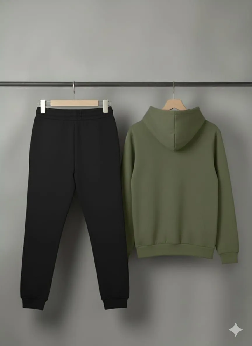 Tracksuit Summary A two-piece tracksuit featuring an olive green hoodie and black jogger-style sweatpants, both carrying a distinctive, stylized logo.